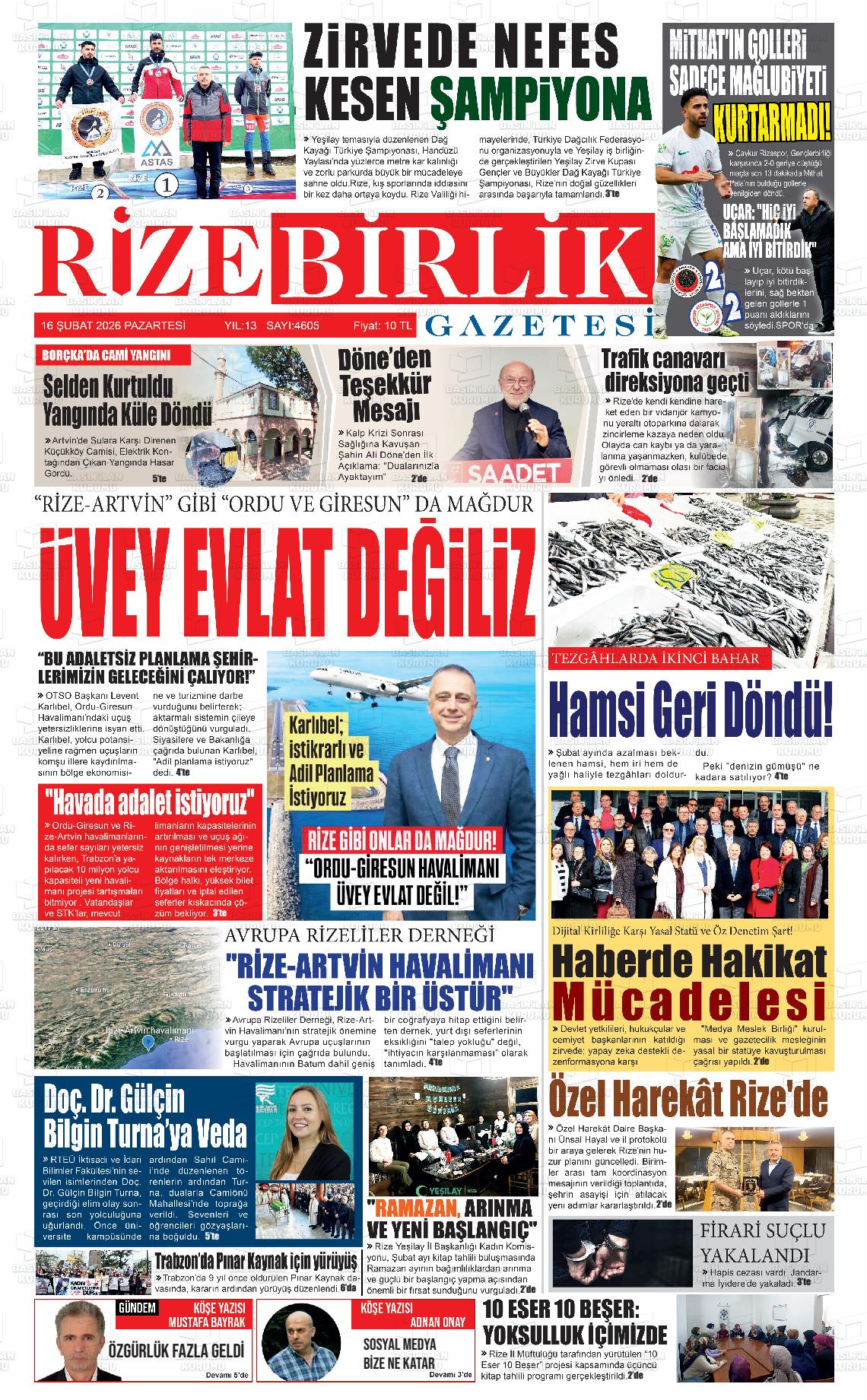Rİze Yerel Gazeteleri 17 Şubat 2026, Salı Günü Manşeti