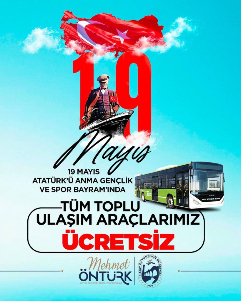 Hatay Büyükşehir Belediyesi, 19 Mayıs Atatürk’ü Anma, Gençlik ve Spor Bayramı’nda vatandaşlara kolaylık sağlamak amacıyla belediye otobüslerini ücretsiz olarak hizmete sunacağını duyurdu.
