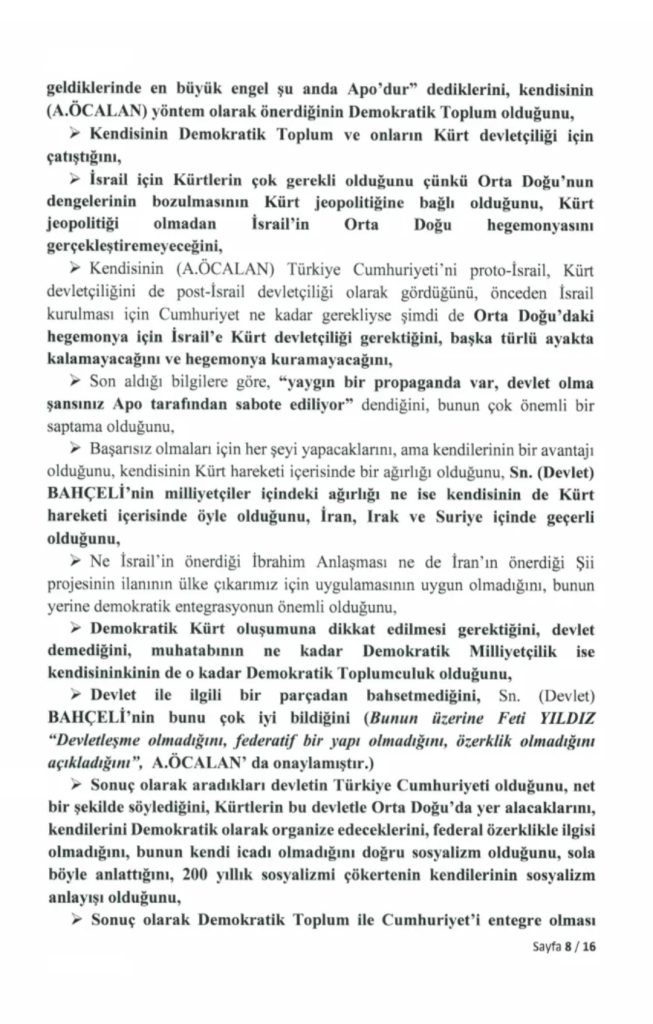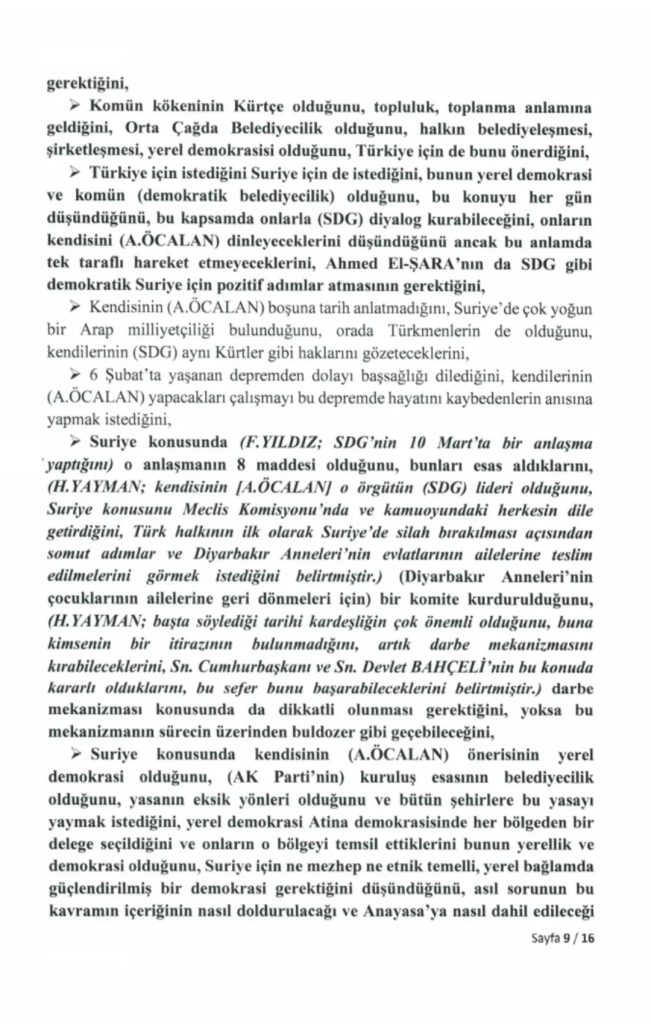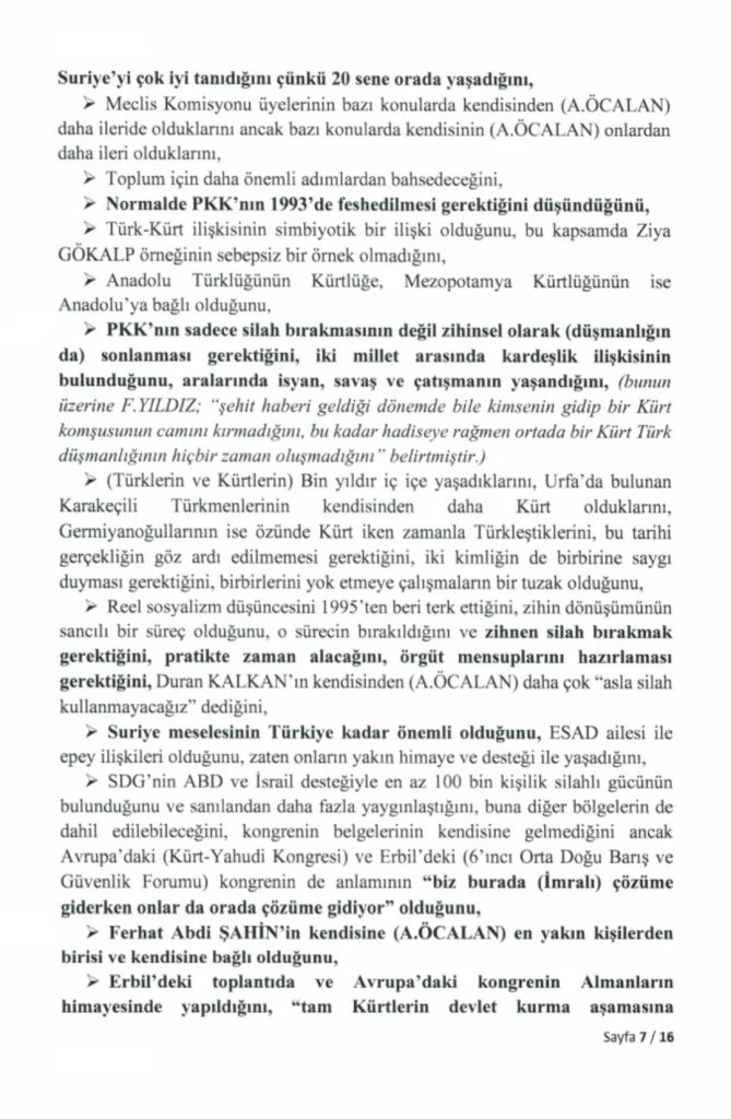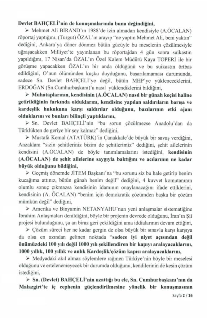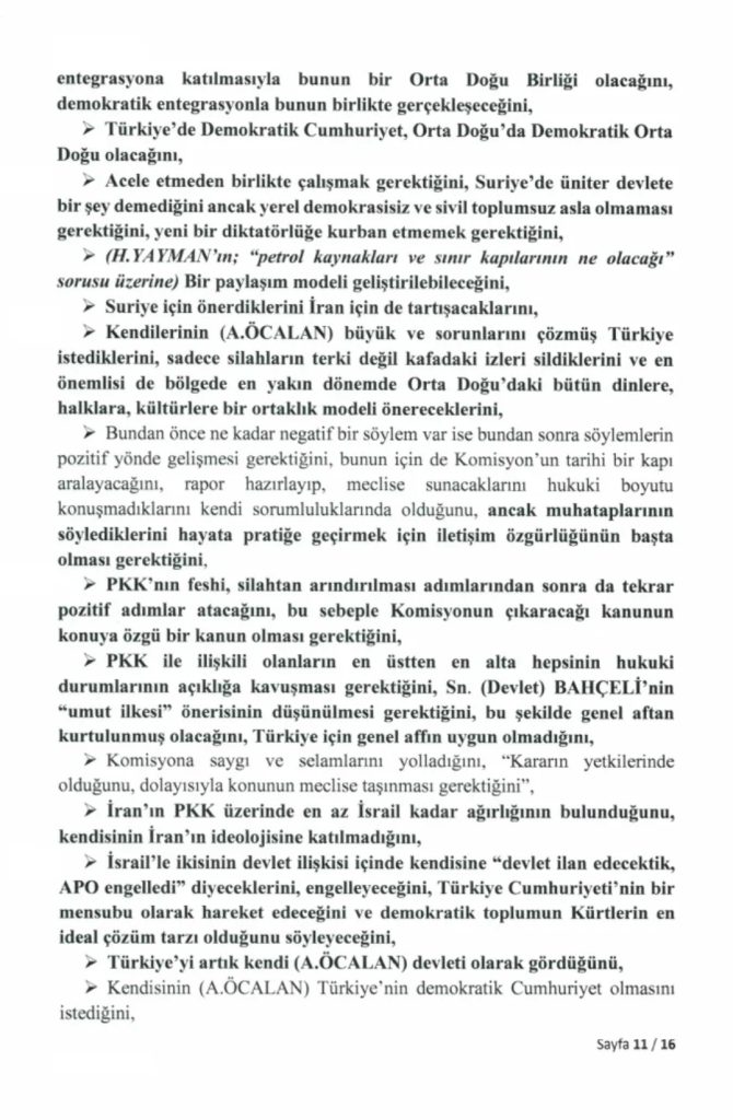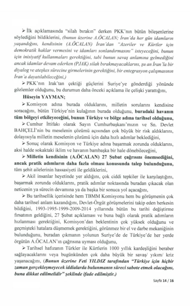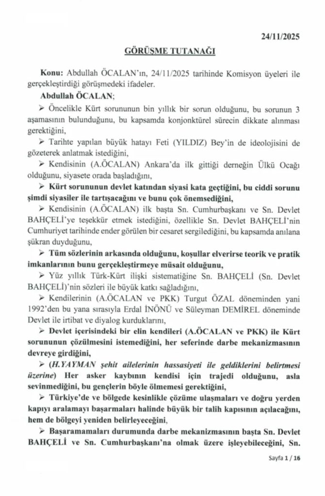 “Milli Dayanışma, Kardeşlik ve Demokrasi Komisyonu” adına 24 Kasım’da İmralı Cezaevi’ne giden milletvekillerinin PKK lideri Abdullah Öcalan ile gerçekleştirdiği görüşmeye ilişkin 16 sayfalık tutanak, Türkiye Büyük Millet Meclisi’nin resmi internet sitesinde yayımlandı.