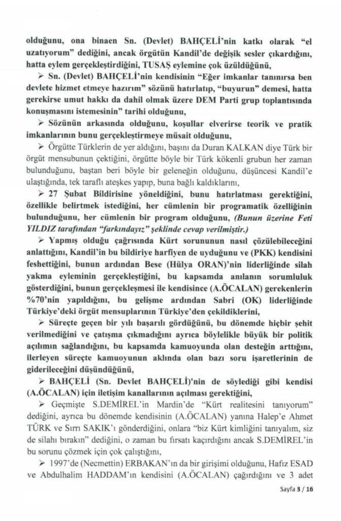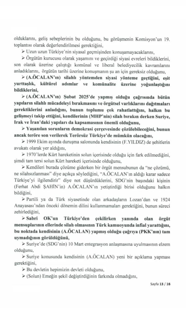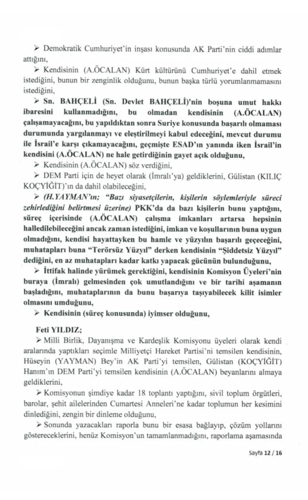 TBMM kayıtlarında yer alan tutanakta, görüşmenin içeriği ve başlıklar halinde ele alınan konulara ilişkin detaylar bulunuyor. Görüşmenin özet tutanakları ise 4 Aralık’ta yapılan komisyon toplantısında milletvekillerine okunmuştu.Öcalan’ı İmralı’da ziyaret eden isimler arasında AK Parti Genel Başkan Yardımcısı Hüseyin Yayman, DEM Parti Grup Başkan Vekili Gülistan Kılıç ve MHP’li Feti Yıldız yer almıştı.