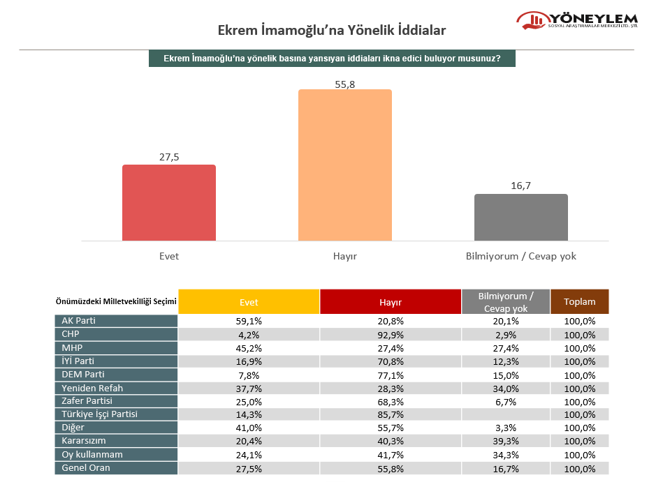 19-22 Mayıs 2025 tarihleri arasında 2 bin kişiyle yapılan anket çalışmasında katılımcılara, “Ekrem İmamoğlu’na ait basına yansıyan iddiaları ikna edici buluyor musunuz?” sorusu yöneltildi. Katılımcıların yüzde 55,8’i “hayır” yanıtını verirken, yüzde 27,5’i “evet” dedi. Yüzde 16,7’lik bir kesim ise soruya yanıt vermedi.
