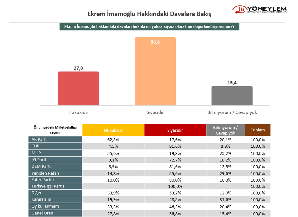 Araştırmada yer alan bir diğer dikkat çekici soru ise “İmamoğlu hakkındaki davaları hukuki mi yoksa siyasi olarak mı değerlendiriyorsunuz?” oldu. Bu soruya katılımcıların yüzde 56,8’i “siyasi” yanıtını verirken, yüzde 27,8’i davaları “hukuki” buldu. Yüzde 15,4’lük bir kesim ise bu soruya yanıt vermekten kaçındı.